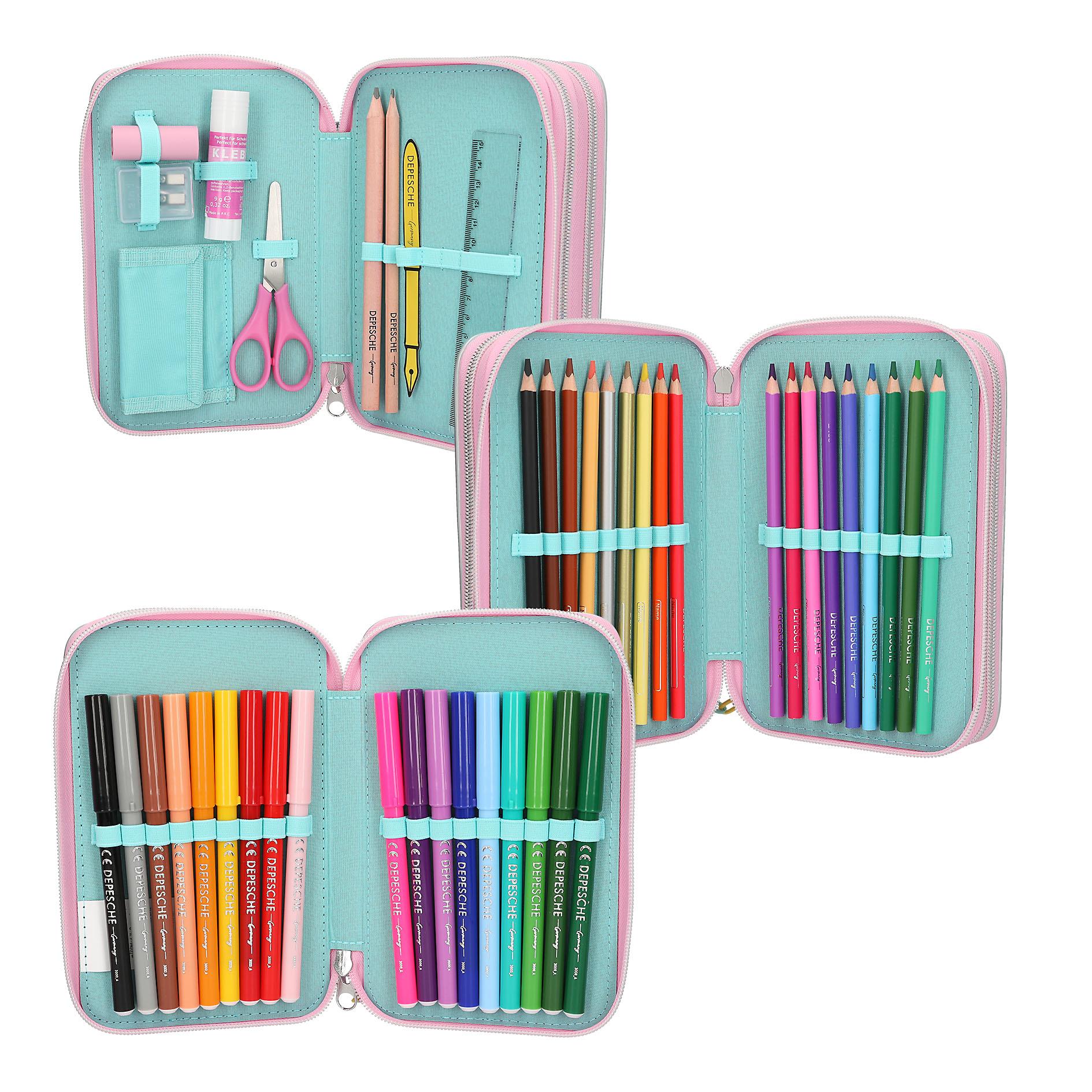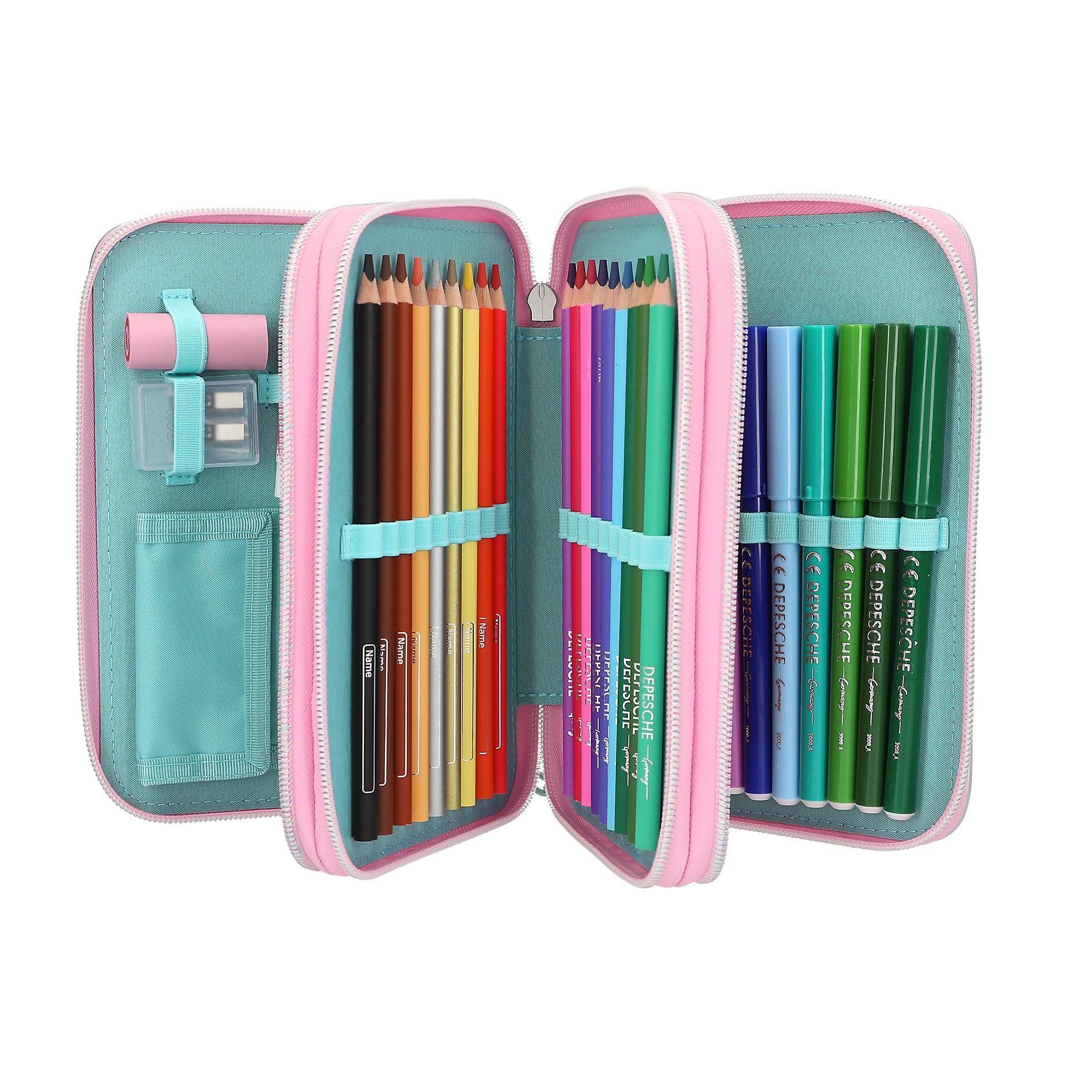 Блестящий и красивый! Этот серебристый пенал TOPModel украшен крупным принтом TOPModel на лицевой стороне, а на обратной стороне — разноцветными конфетти. Прошитые края переливаются в крутом голографическом стиле. Милая маленькая деталь: цветная цепочка сбоку. Три отдельных отделения полностью укомплектованы 18 цветными карандашами и фломастерами в каждом, 2 обычными карандашами, линейкой, ластиком, точилкой для карандашей, ножницами, клеем-карандашом и небольшим кармашком на липучке. Материал: 100% полиэстер; лицевая сторона: 100% ПВХ Предупреждение: Опасность удушения! Мелкие детали. Не подходит для детей младше 36 месяцев. Рекомендуемый возраст: от 6 лет Размеры: 20,0 x 13,0 x 7,5 см
