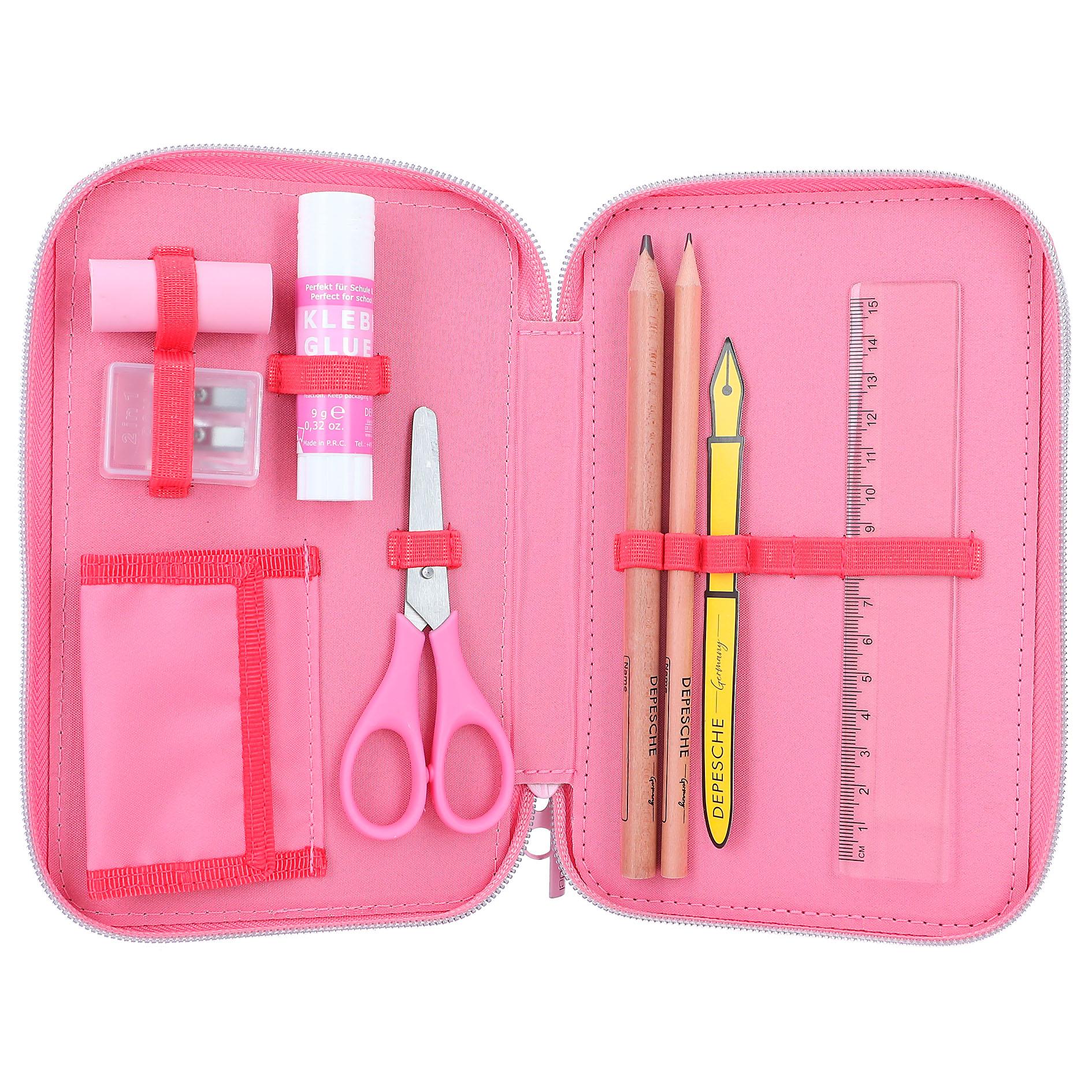 Сердце пенала TOPModel из серии One Love находится в правильном месте: повсюду! Милый узор в виде сердечек по всей поверхности в великолепных красных и розовых тонах подарит вам хорошее настроение. Милый трюк: сердце на цепочке можно вытащить и вставить в накладной прозрачный передний карман. Три отдельных отделения пенала полностью заполнены 18 цветными карандашами и фломастерами, 2 карандашами, линейкой, точилкой, ластиком, ножницами, клеем-карандашом и небольшой сумочкой на липучке. Материал: 100% ПЭС; ПВХ спереди; ПУ кулон Рекомендуемый возраст: от 6 лет В 4,5 х Ш 25,0 х Г 20,0 см