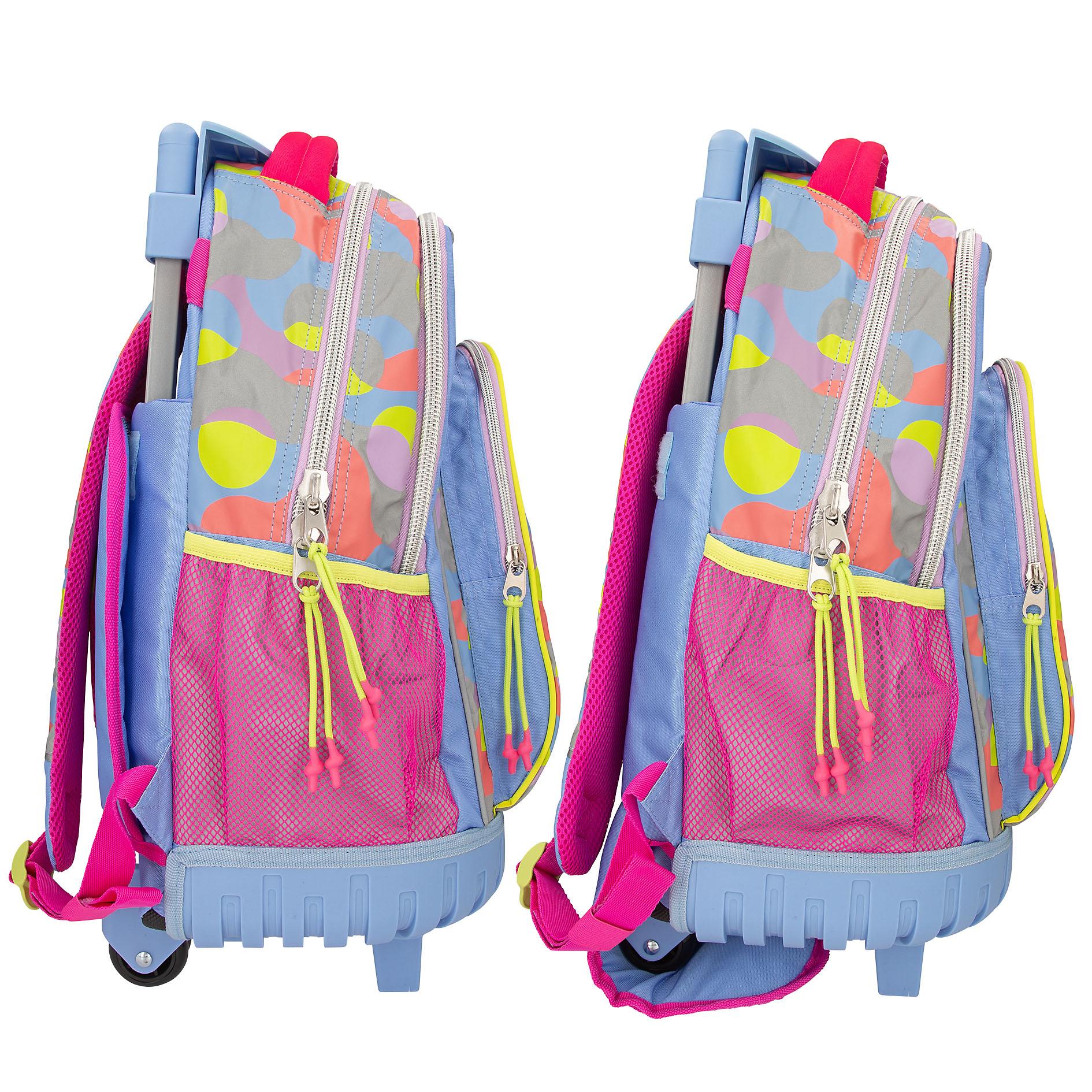 Привлекательный и стильный рюкзак для путешествий! Этот рюкзак TOPModel украшен модным, красочным графическим рисунком, выполненным исключительно из светоотражающего материала на передней части, боковых сторонах и плечевых лямках. Нашивка TOPModel на передней части, яркие неоновые детали, встроенный держатель для рюкзака с плавно вращающимися колесиками и телескопической ручкой (выдвигается примерно до 86 см), три отдельных отделения, боковые сетчатые карманы, мягкая ручка для переноски, мягкие плечевые лямки и задний клапан, закрывающий колеса и защищающий одежду от загрязнений во время переноски. Размеры: 34 x 24 x 50 см Объем: 28 л Вес: около 2000 г Материал: 100% полиэстер Рекомендуемый возраст: от 6 лет В 52 x Ш 32 x Г 25 см