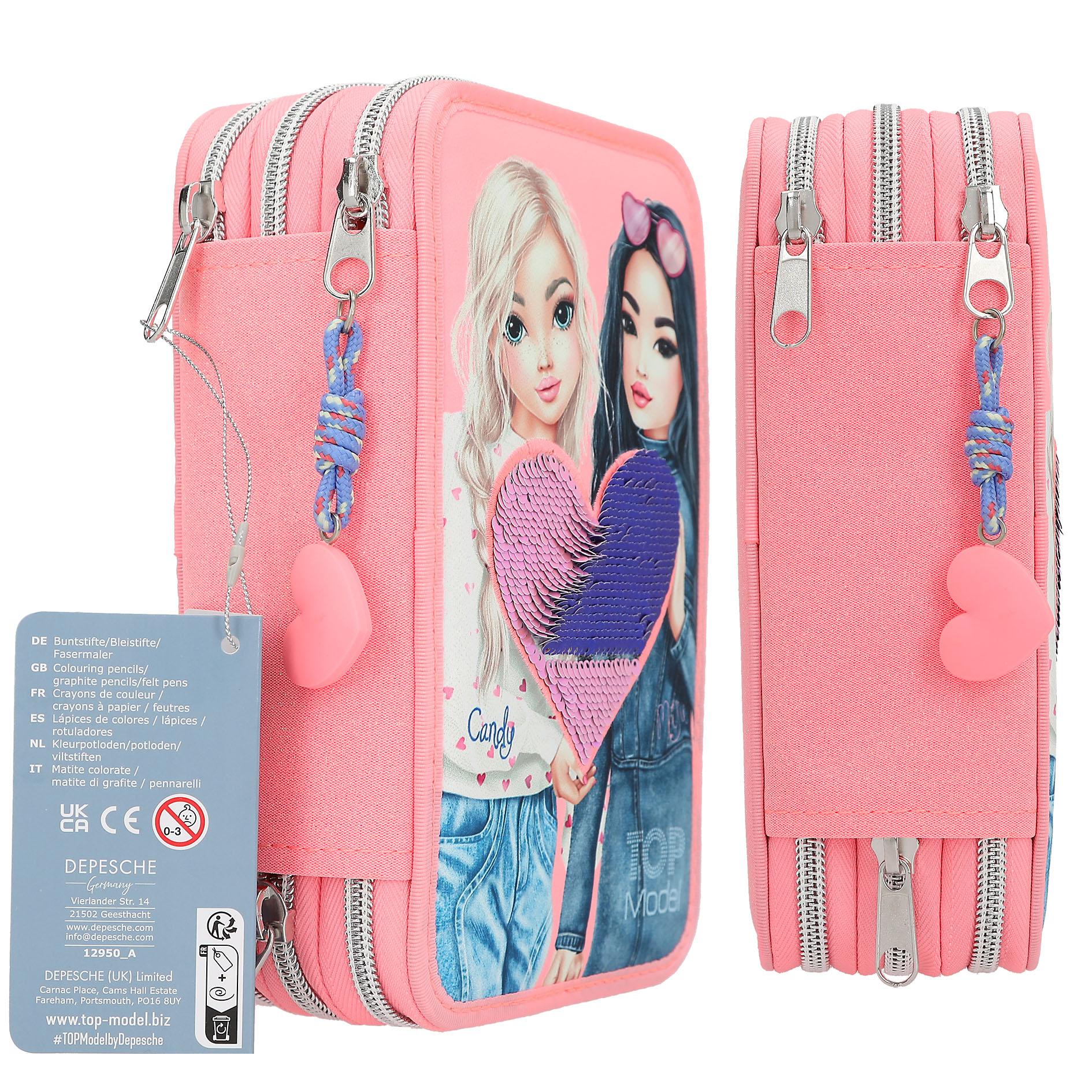 Честно! Честно! Это очень сверкающий розовый пенал TOPModel. Он украшен большим сердцем из двусторонних пайеток розового и сиреневого оттенков на лицевой стороне. Приятный бонус: объемный брелок в виде сердца с модной синей лентой на молнии. Три отдельных отделения полностью укомплектованы 18 цветными карандашами и фломастерами, 2 обычными карандашами, точилкой, ластиком, линейкой, ножницами, клеем-карандашом и небольшим кармашком на липучке. Материал: 100% полиэстер Предупреждение: Опасность удушения! Мелкие детали. Не подходит для детей младше 36 месяцев. Рекомендуемый возраст: от 6 лет Размеры: 20,5 x 14,3 x 7,5 см (В x Ш x Г)