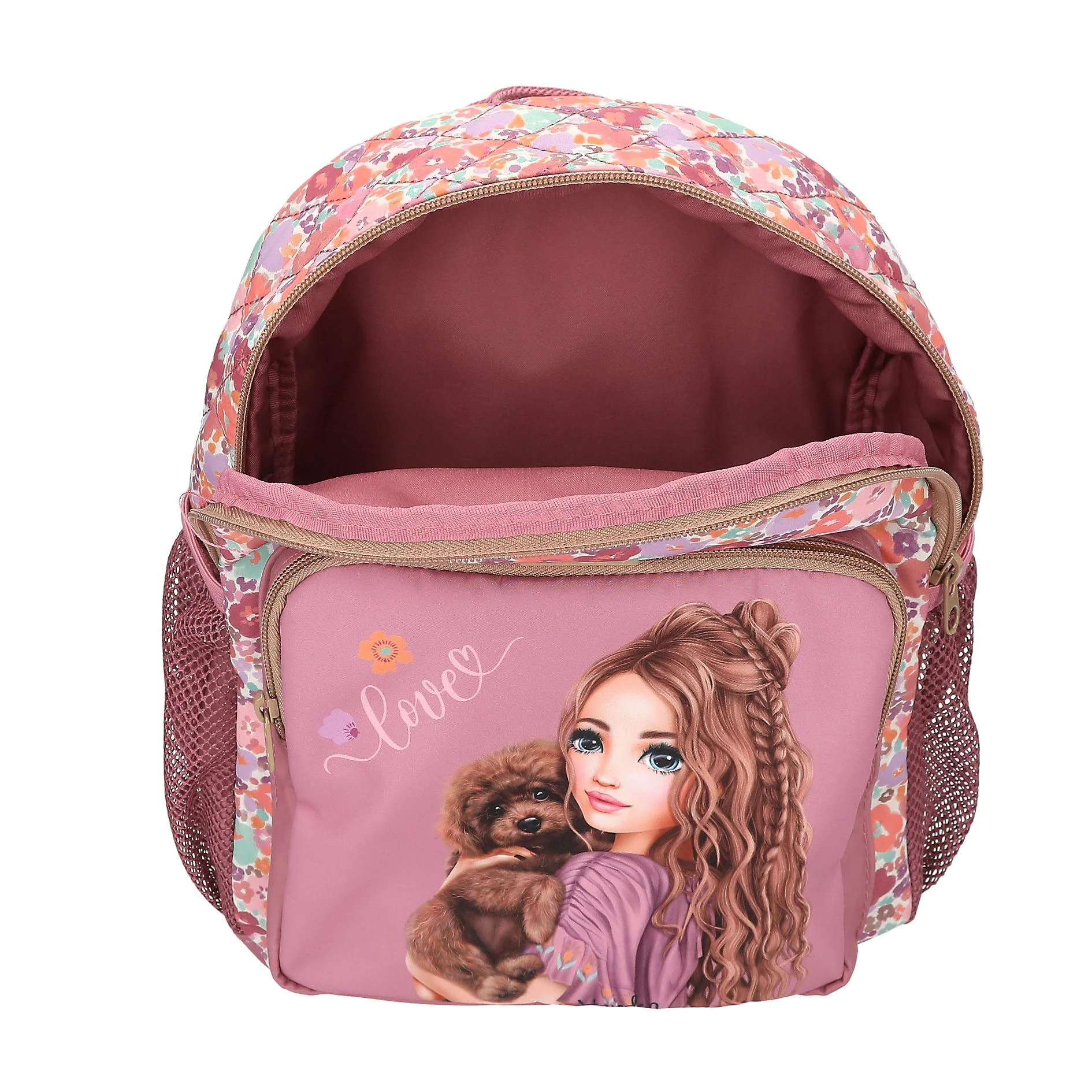 Фантастический цветочный принт 🌸 Этот вместительный рюкзак ягодного цвета из новой серии TOPModel украшен стильным изображением модели и очаровательной собачкой на переднем кармане. Основное отделение рюкзака с цветочным принтом имеет модную ромбовидную стежку. Мягкие регулируемые плечевые лямки. Основной материал: 100% полиэстер В 31 x Ш 25 x Г 13 см Рекомендуемый возраст: 6+